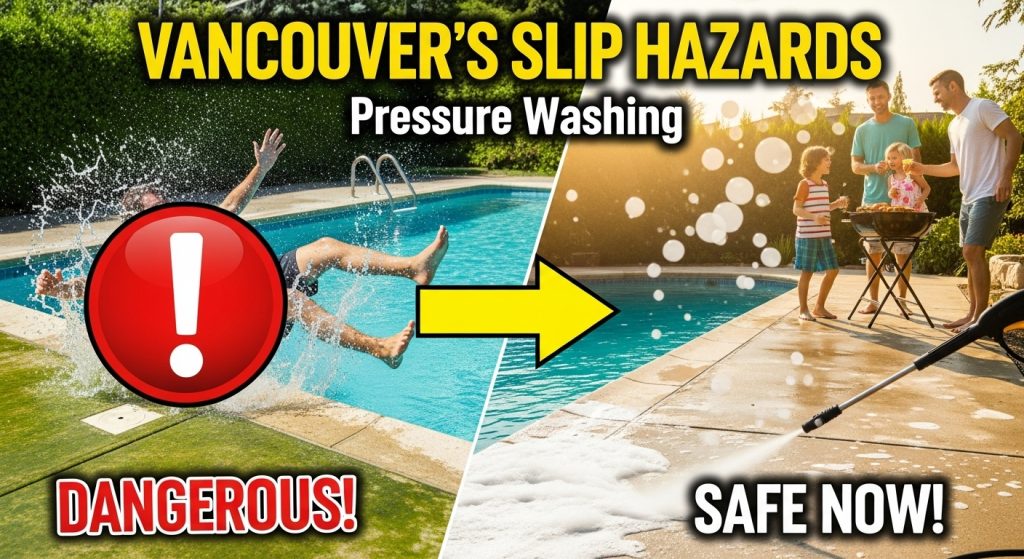 Why Vancouver’s Pool Decks Are Becoming Slip Hazards (And How Professional Pressure Washing Creates Safe Summer Entertaining Spaces)